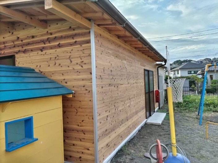 木製外壁の保護材の塗装|神奈川県平塚市の某幼稚園にて塗り替え塗装中