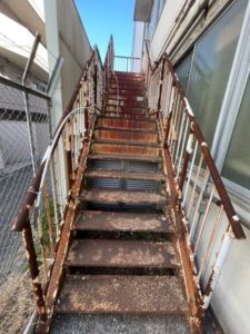 酷い錆が広がった共用階段の塗装工事|神奈川県横浜市の某社屋にて塗り替え塗装中