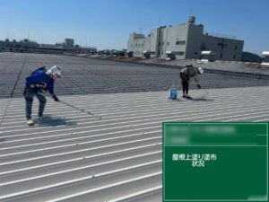折板屋根の上塗り塗装(主材2回目の塗布)|神奈川県秦野市の工場にて防水工事