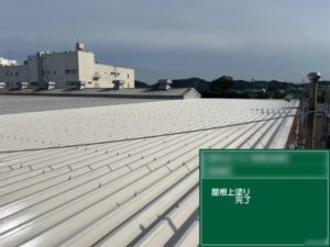 折板屋根の上塗り塗装(主材2回目の塗布)|神奈川県秦野市の工場にて防水工事