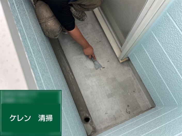 旧塗膜や汚れをスクレーパーで丁寧に除去し、下地の密着性を高めるためにケレン作業を行いました。