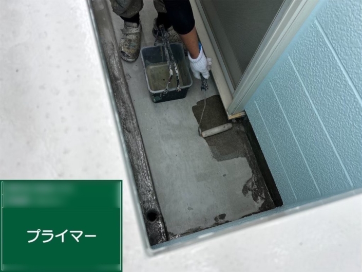 下地と防水材の密着を良くするため、専用プライマーをローラーで均一に塗布しました。乾燥時間を十分に確保し、次工程へ進みます。