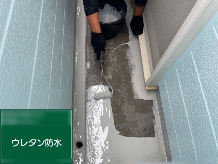 ローラーを用いて、液状のウレタン防水材を均一に塗布。厚みを確保しながら複数回施工することで、柔軟性と防水性に優れた防水層を形成しました。