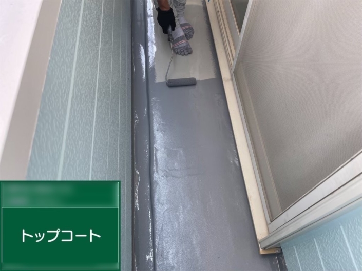 最後にトップコートを施工。紫外線や風雨による劣化を防ぎ、防水層を長持ちさせるための保護仕上げです。グレー色の塗膜が均一に広がり、美観性も向上しました。