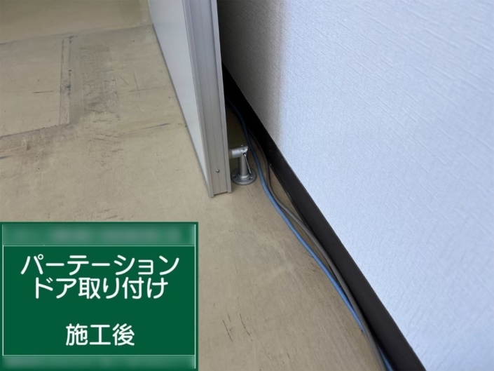 今回の工事では、既存のパーテーションにドアを新設し、作業スペースへの出入りをスムーズにできるよう施工しました。