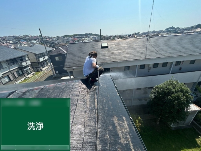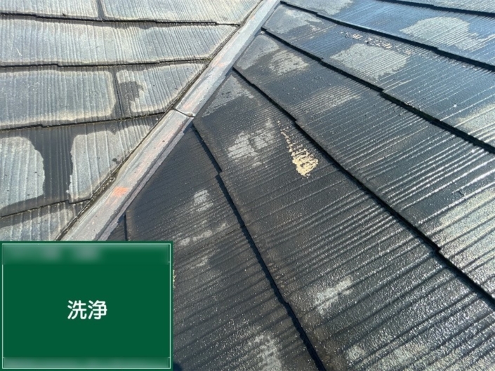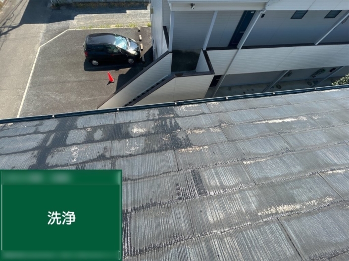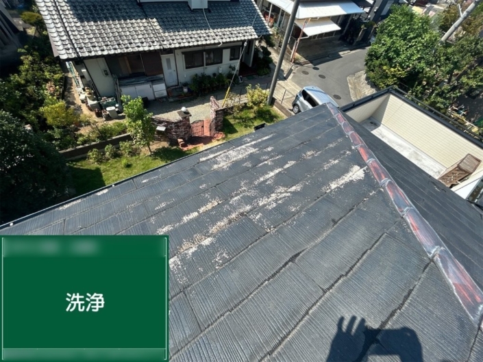 放置するとスレートの素地が吸水し、反りやひび割れにつながる恐れがあったため、まずは高圧洗浄機を用いた洗浄作業で汚れ・旧塗膜・藻類を完全に除去。