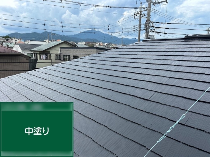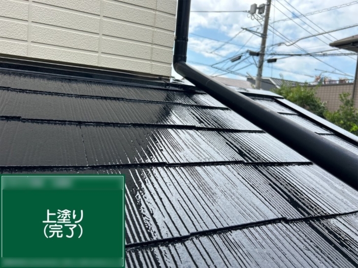 仕上げ後の屋根は、均一な艶と滑らかな塗膜面が確認でき、職人の丁寧な施工が反映された美しい仕上がりです。